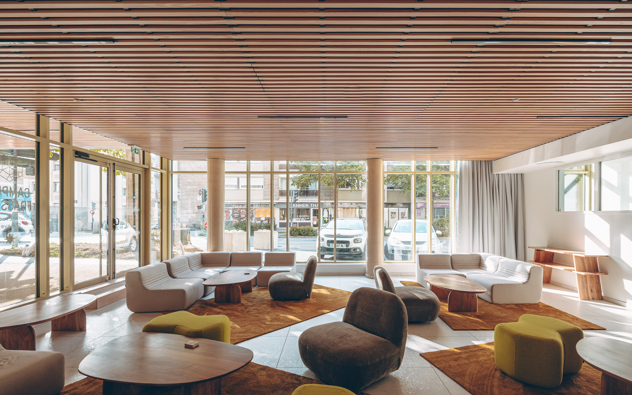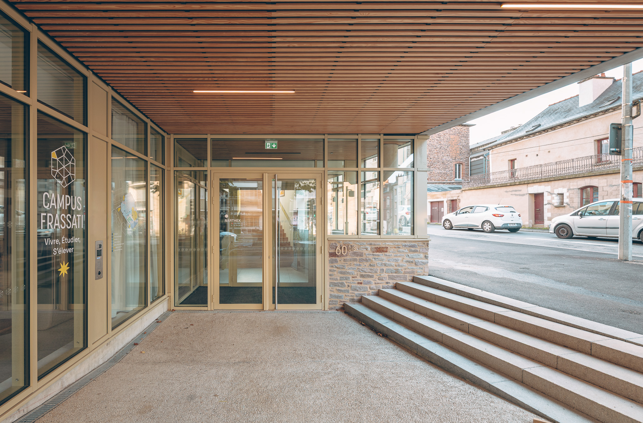 Le Narthex, vaste hall vitré sur rue, relie dedans et dehors et offre un espace d’exposition ou de rencontre. Espaces d’étude, salle commune et cuisine partagée favorisent la vie collective, dans l’esprit d’un lieu d’apprentissage et d’engagement. Frassati n’est pas une résidence classique : les étudiants s’y engagent dans des actions solidaires et associatives.