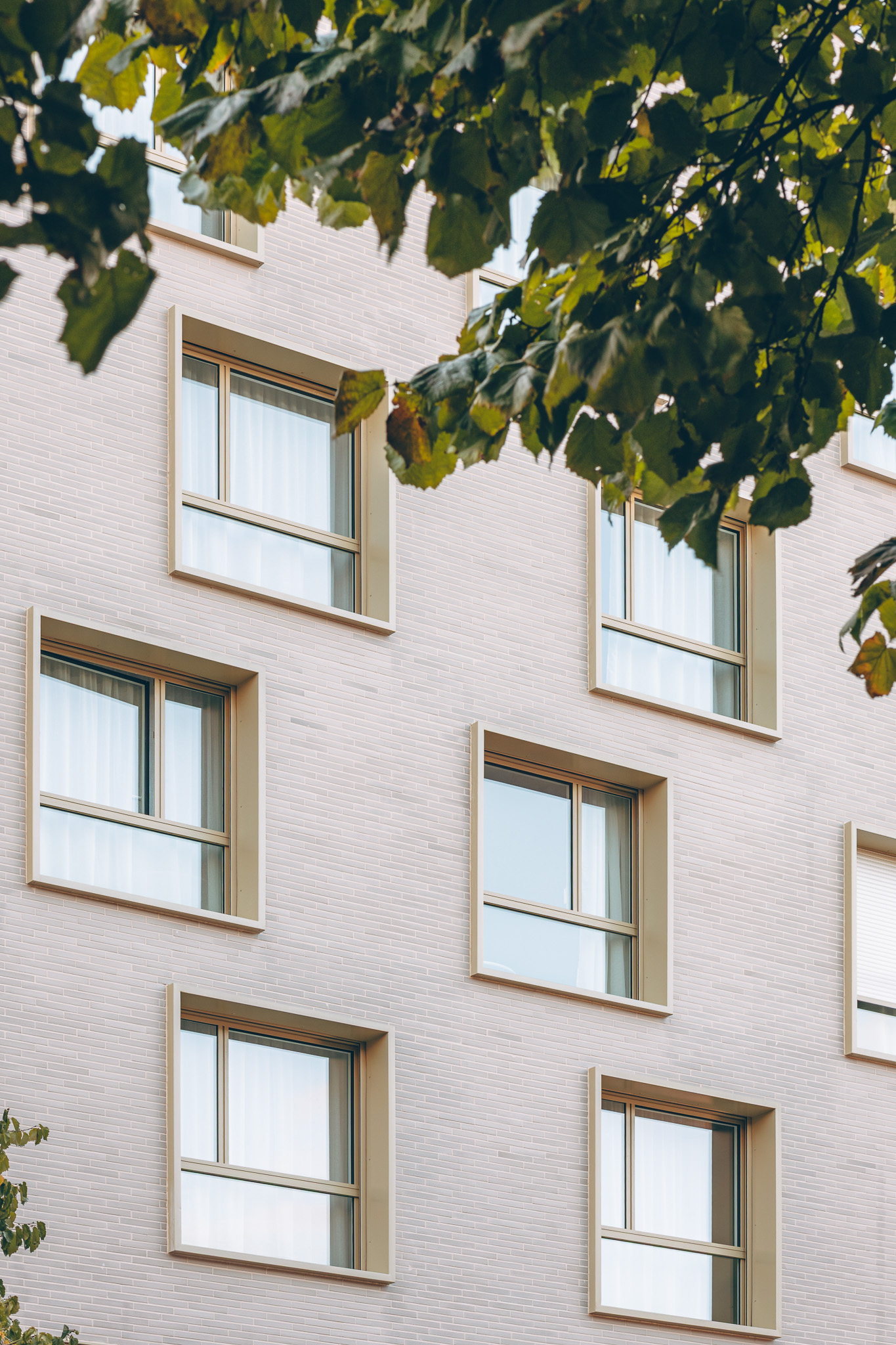 Le soubassement en pierre de schiste réemployée inscrit le projet dans la mémoire du lieu, tandis que les briquettes ocrées et les menuiseries aluminium ton champagne s’accordent avec les façades minérales des bâtiments avoisinants et de l’Hôtel Dieu. Certifié RT2012, la résidence conjugue performance thermique, durabilité des matériaux et pérennité d’entretien.