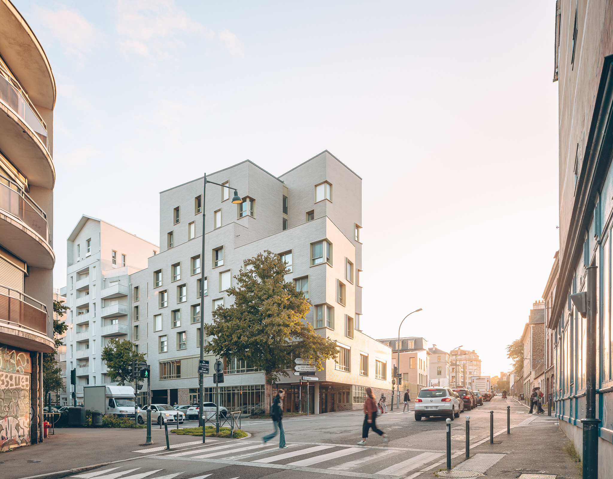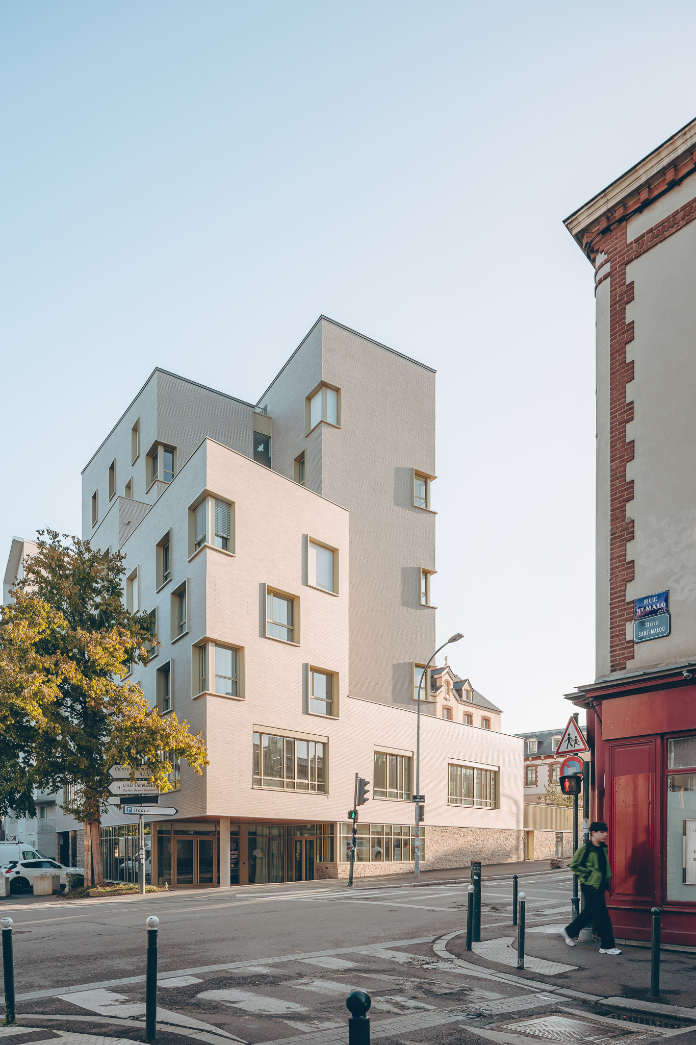 Le bâtiment d’angle affirme son rôle de repère urbain, tout en respectant les gabarits voisins grâce à un travail d’ajustement des hauteurs et de retrait progressif des derniers niveaux. Sa volumétrie sculptée s’adapte aux lignes de la rue et à la déclivité du terrain.