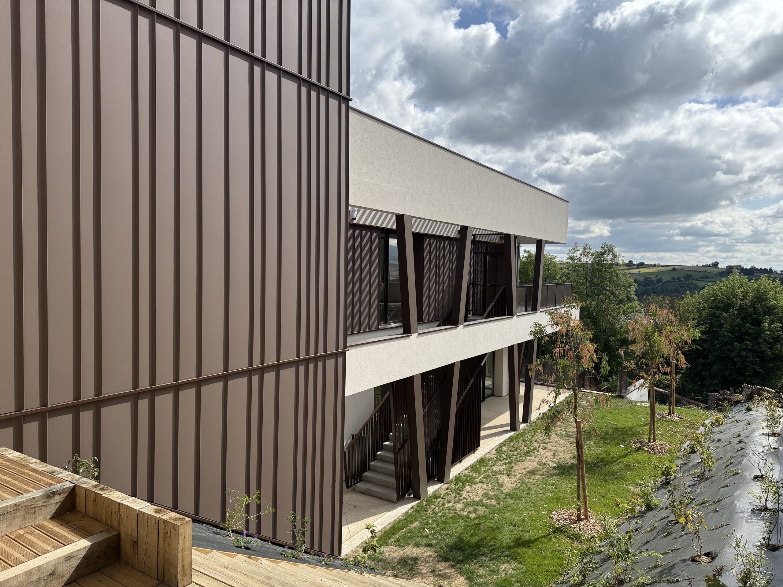 ▪️ L’extension s’intègre par un bardage métallique brun évoquant les menuiseries d’origine, poteaux inclinés, auvent boisé et formes claires.