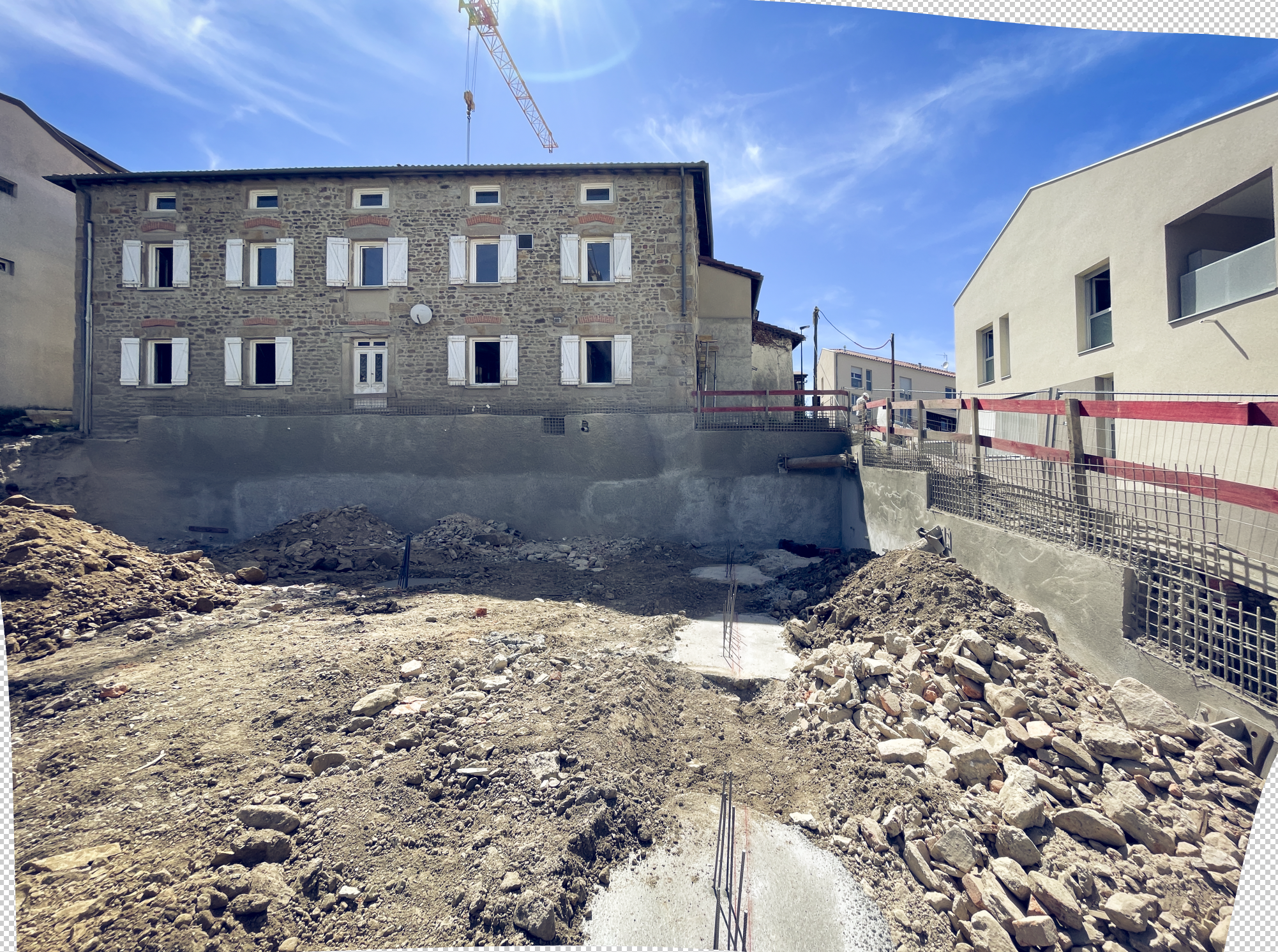 Le chantier a nécessité des interventions géotechniques lourdes (terrain en pente, proximité de la route, présence de réseaux de gaz) :