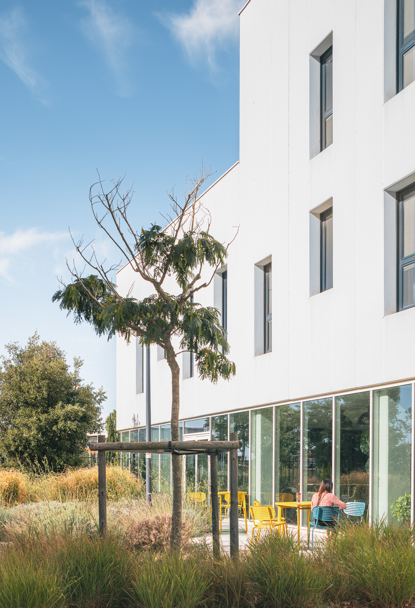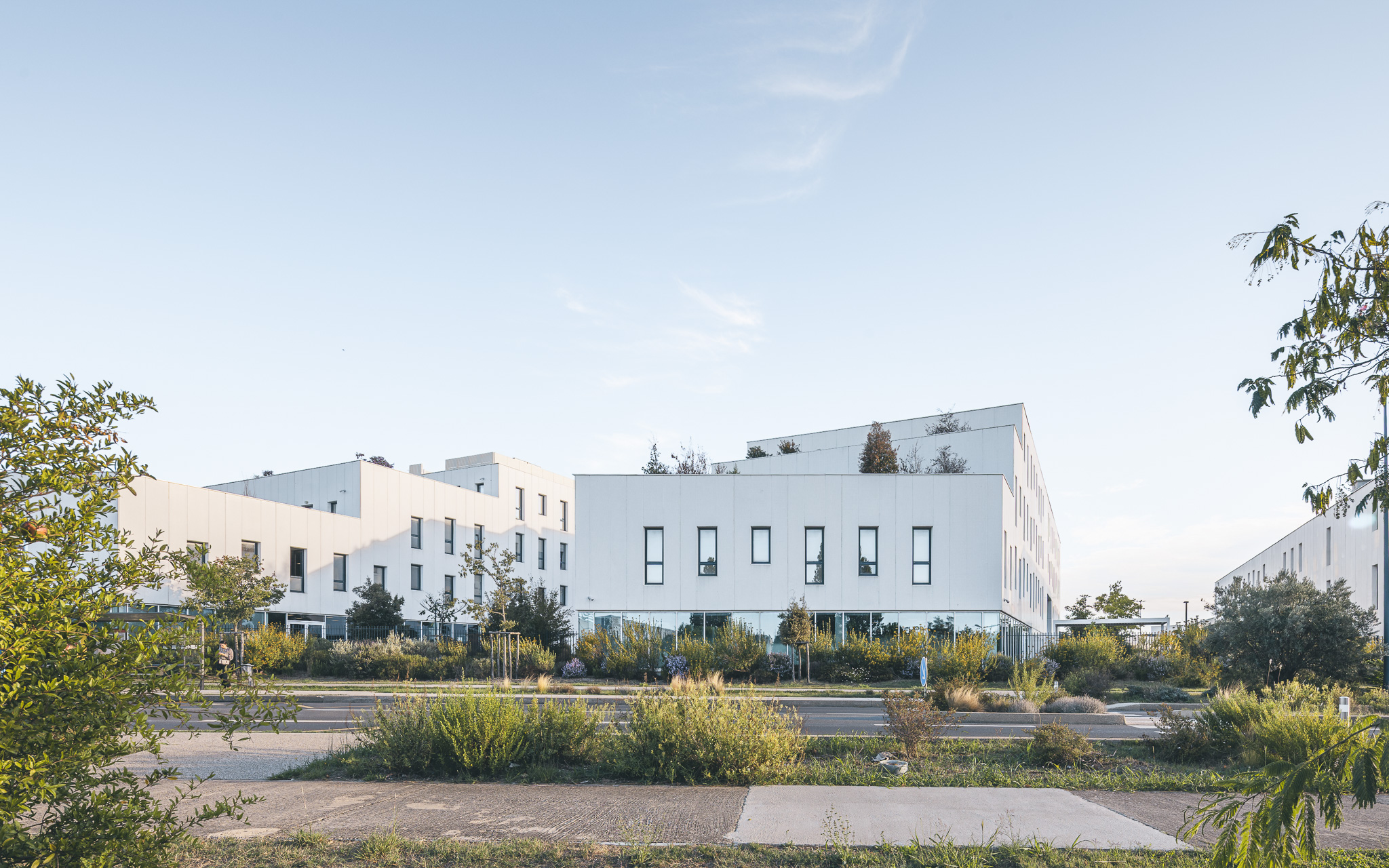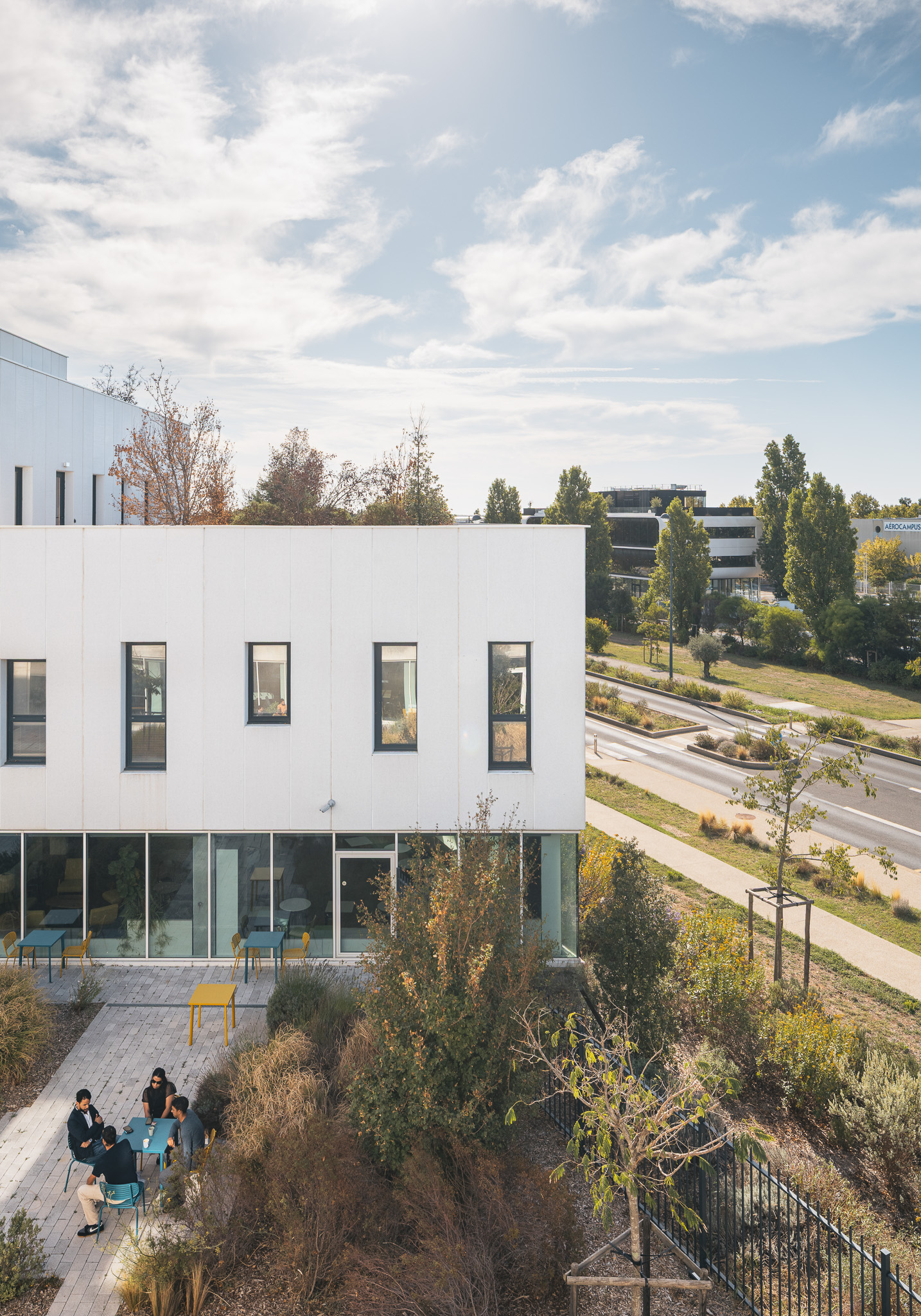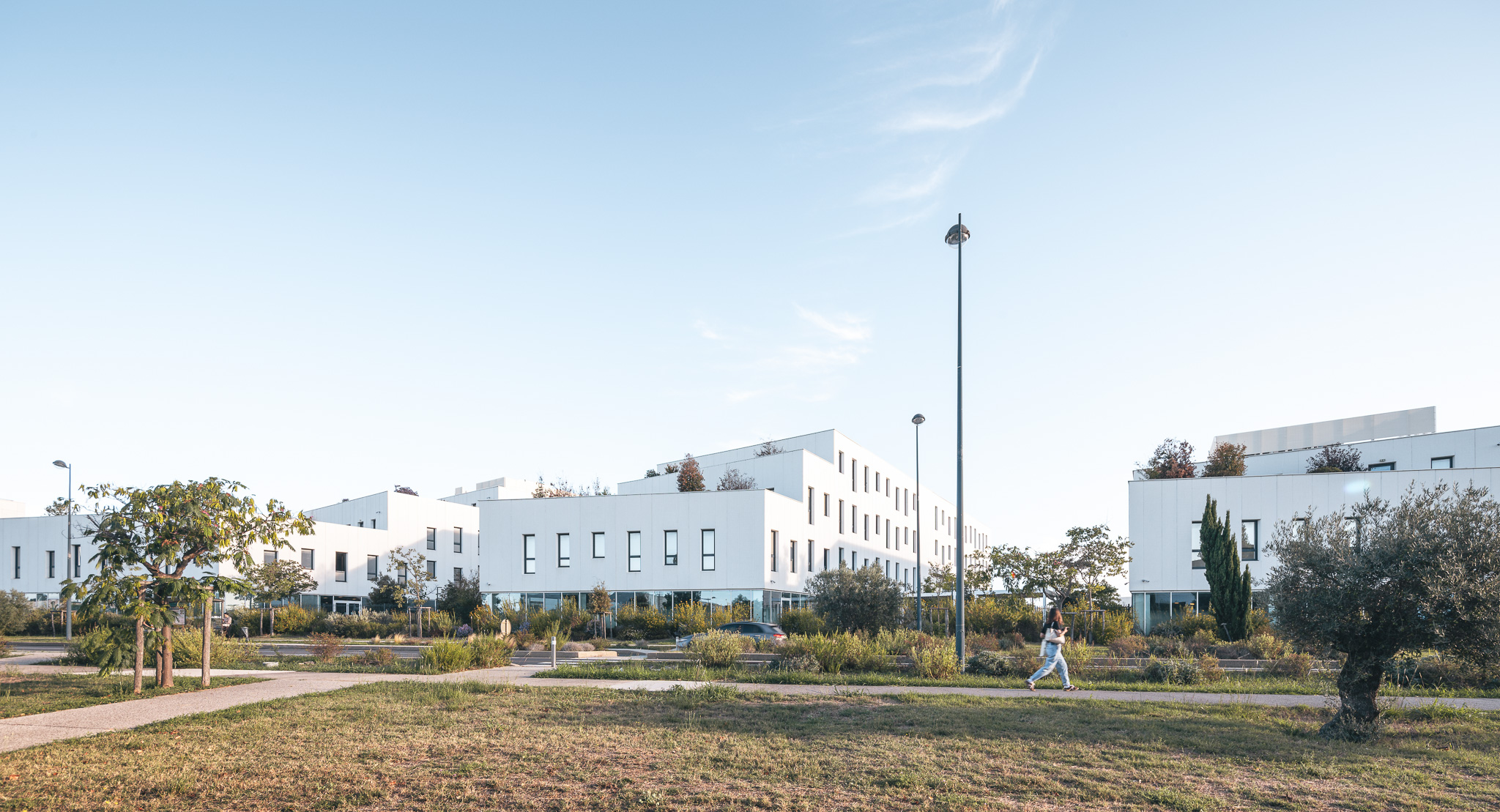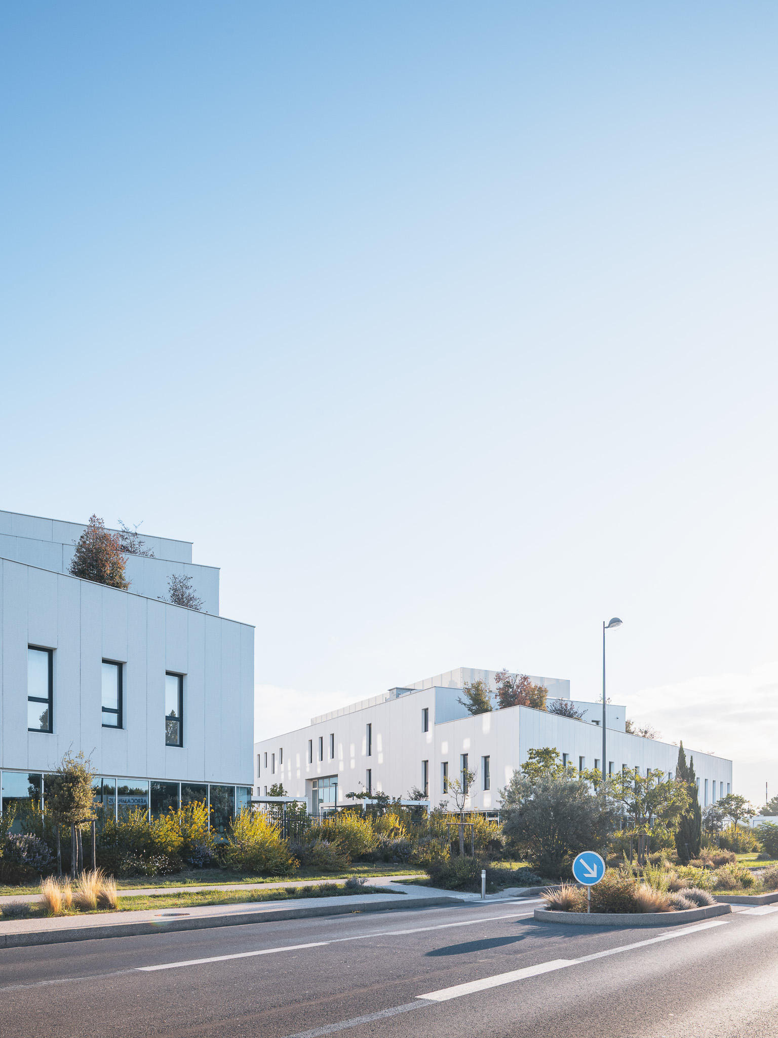 Ensemble parc tertiaire végétalisé et connecté, composé de trois bâtiments dans un parc arboré, sur le site de l’aéroport de Montpellier - Méditerranée.