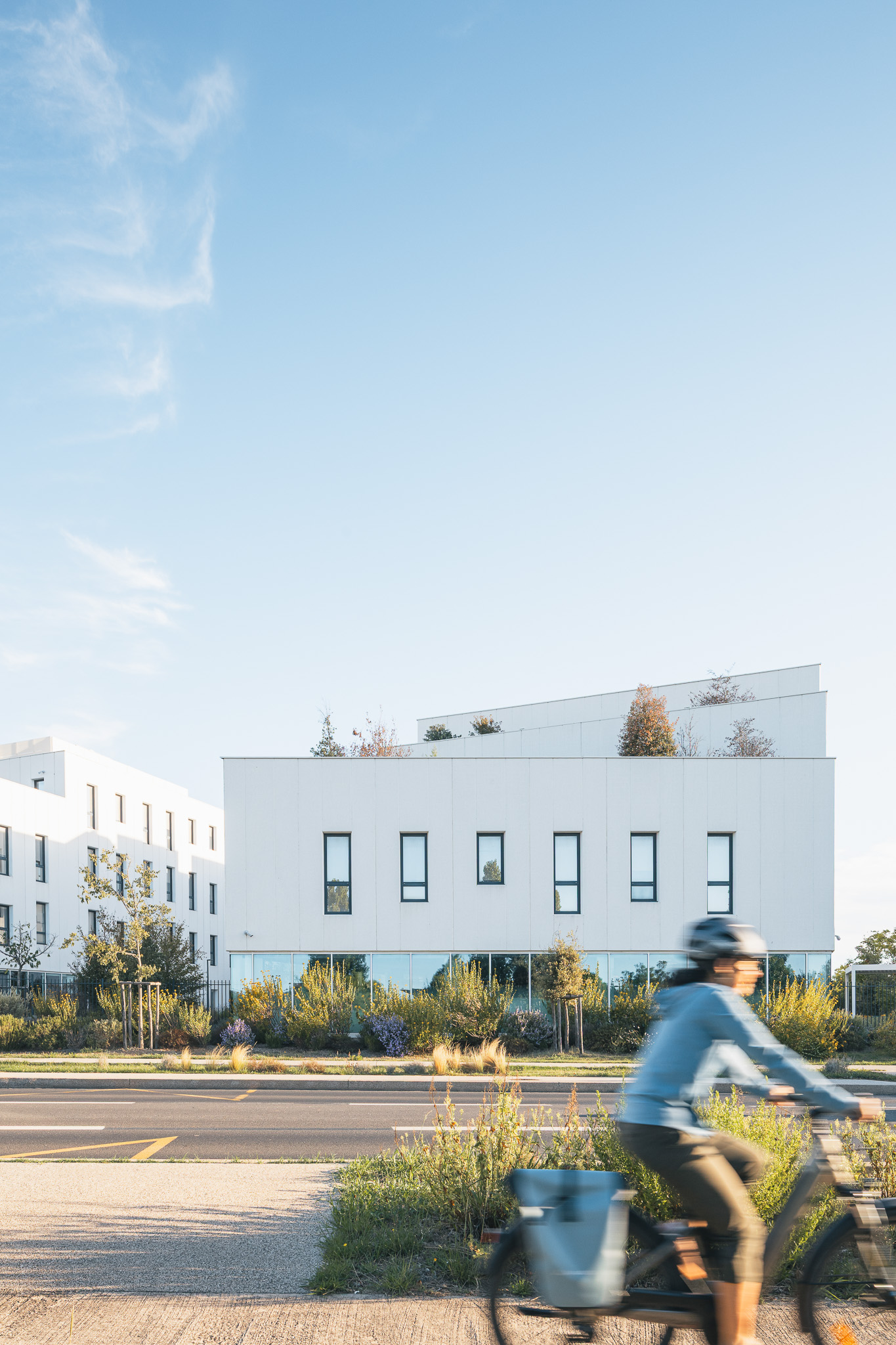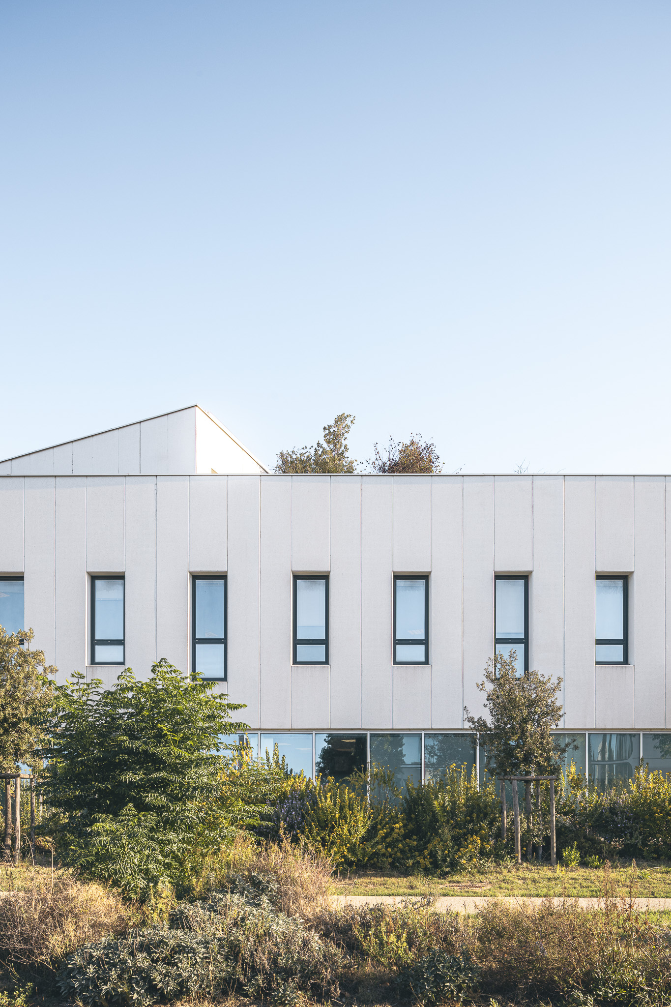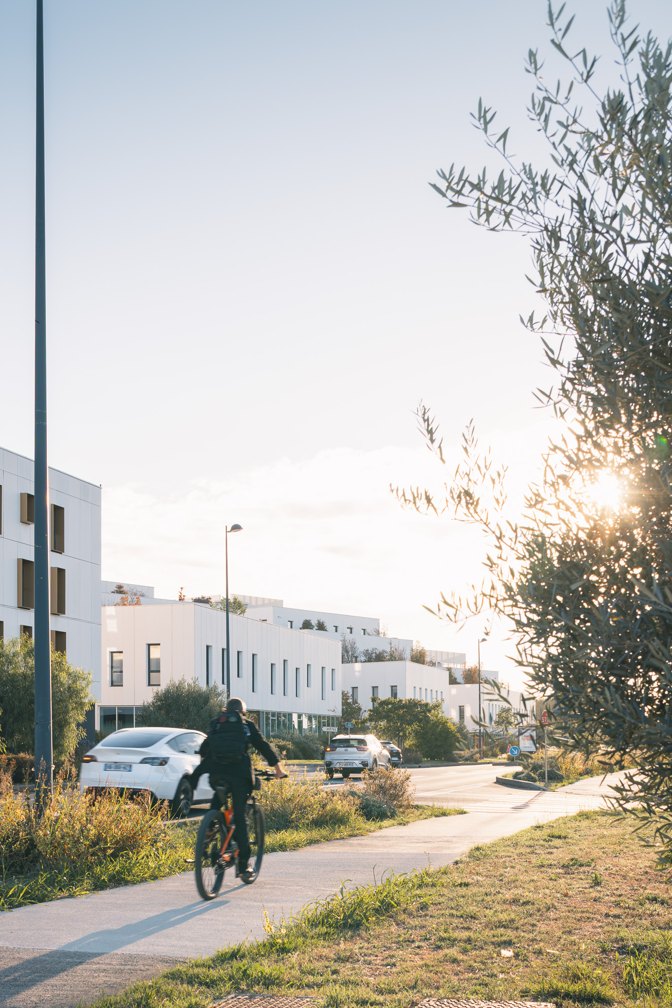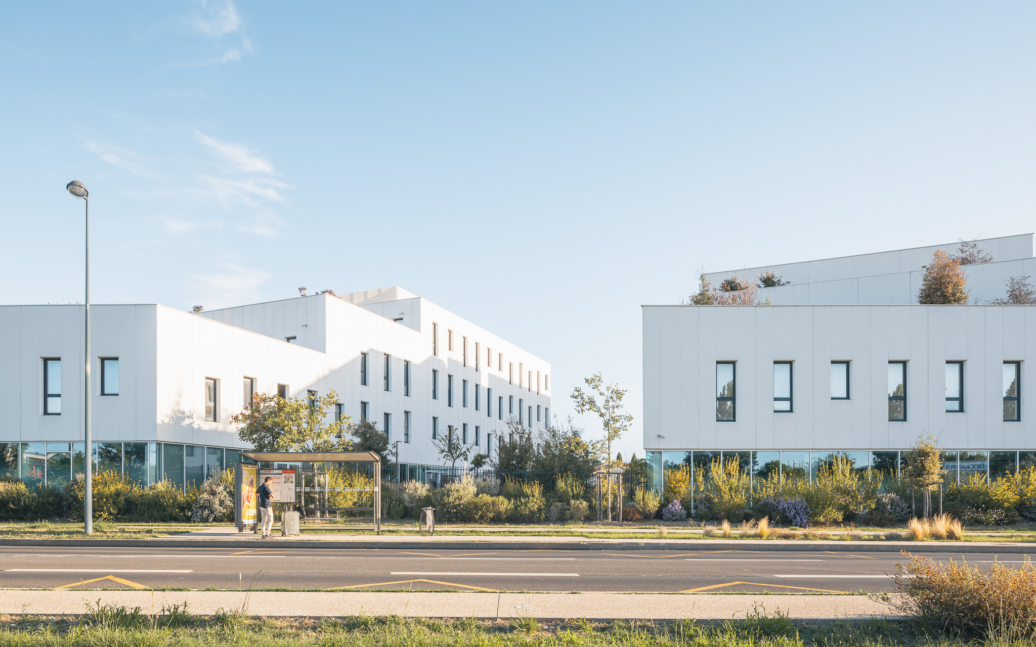 Ensemble parc tertiaire végétalisé et connecté, composé de trois bâtiments dans un parc arboré, sur le site de l’aéroport de Montpellier - Méditerranée.