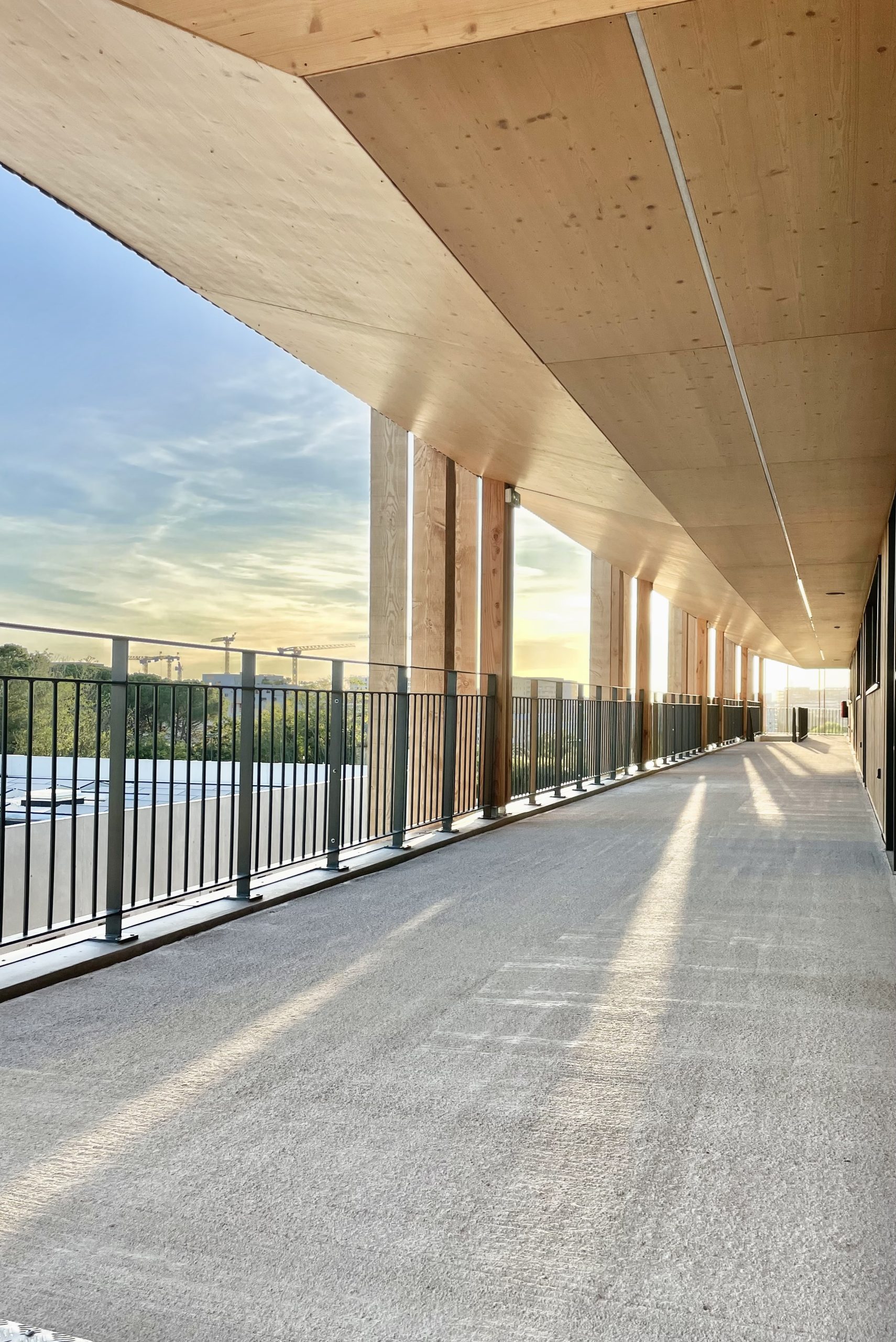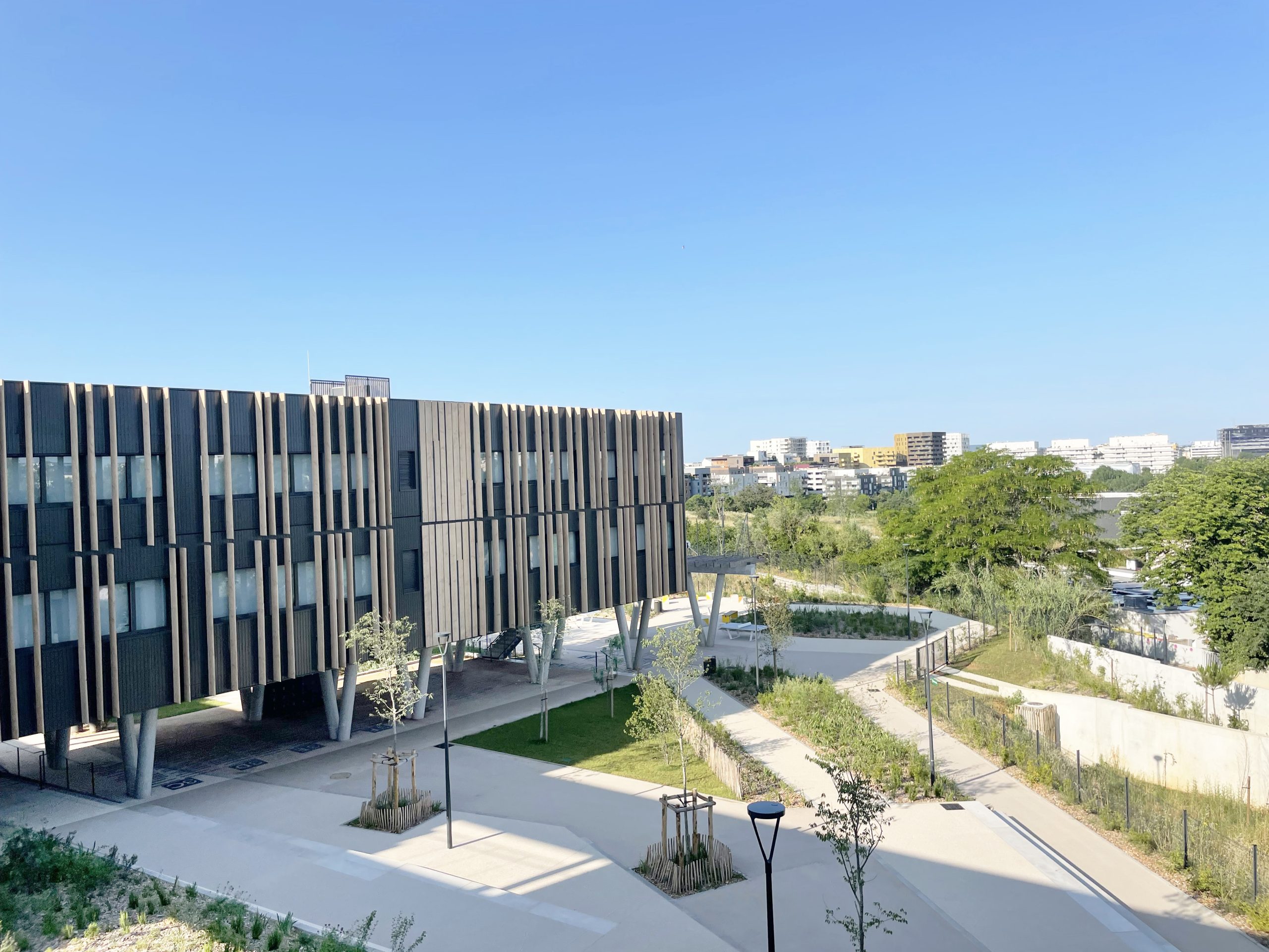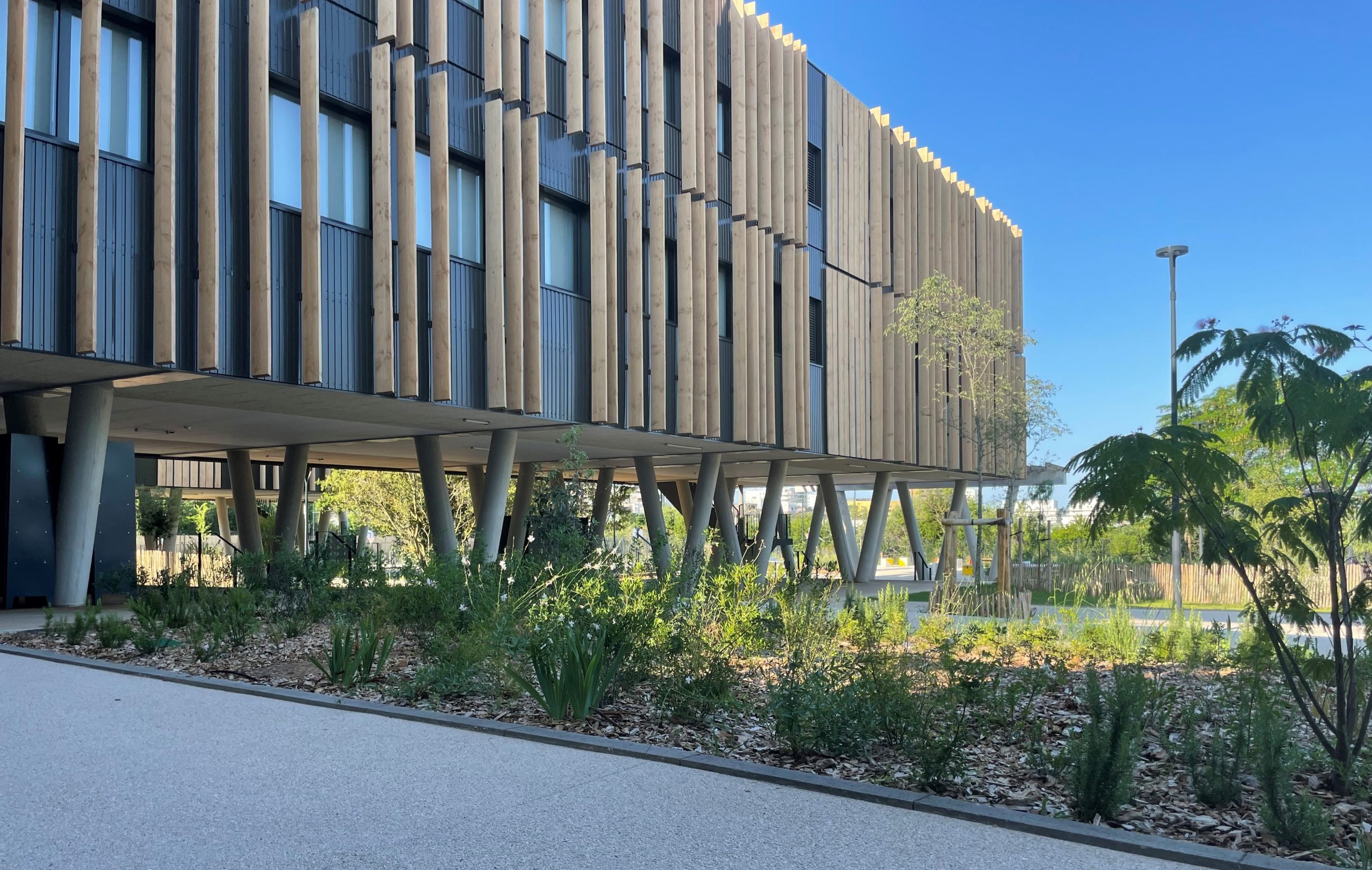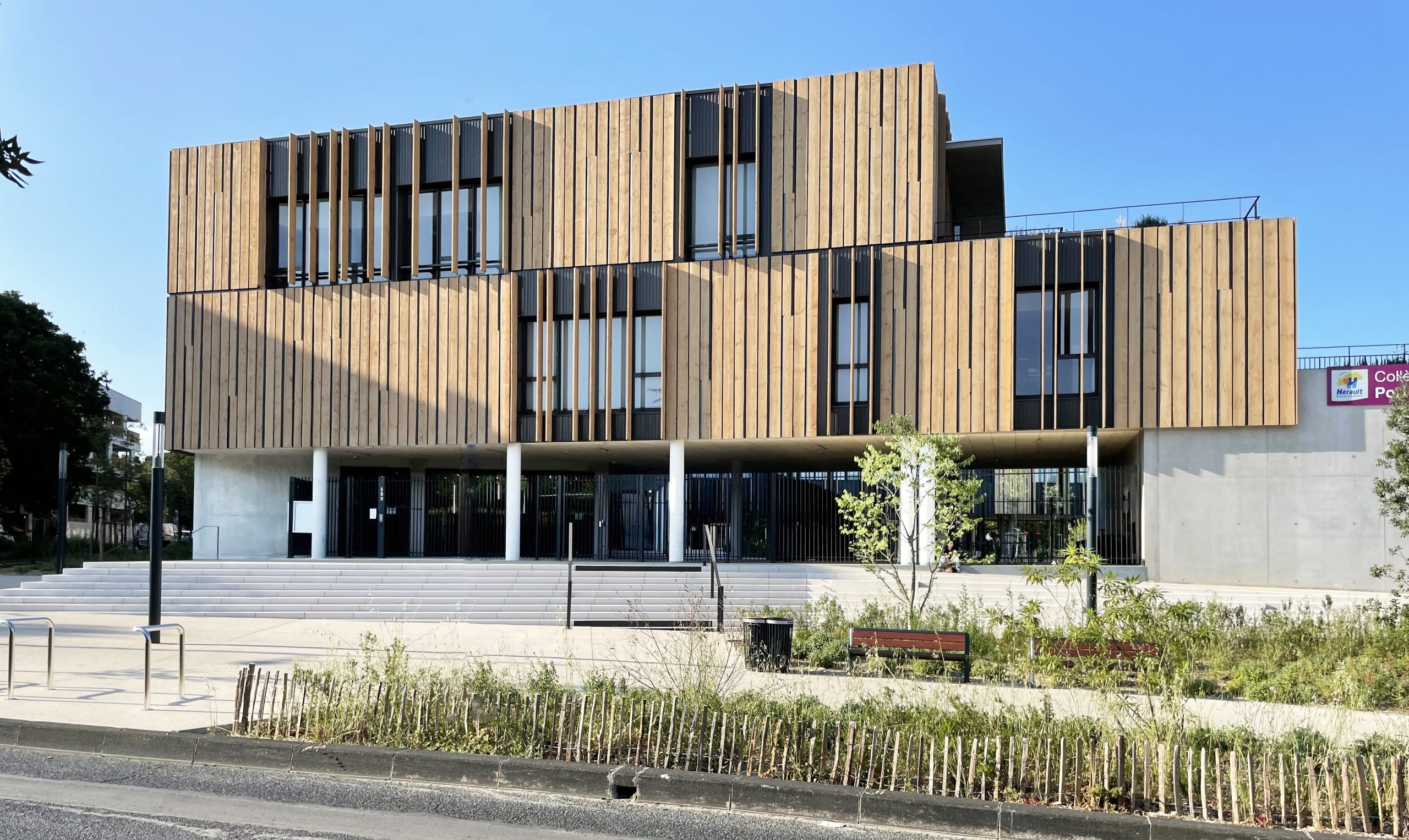 Collège conçu et réalisé en modulaires bois reposant sur des pilotis en béton.