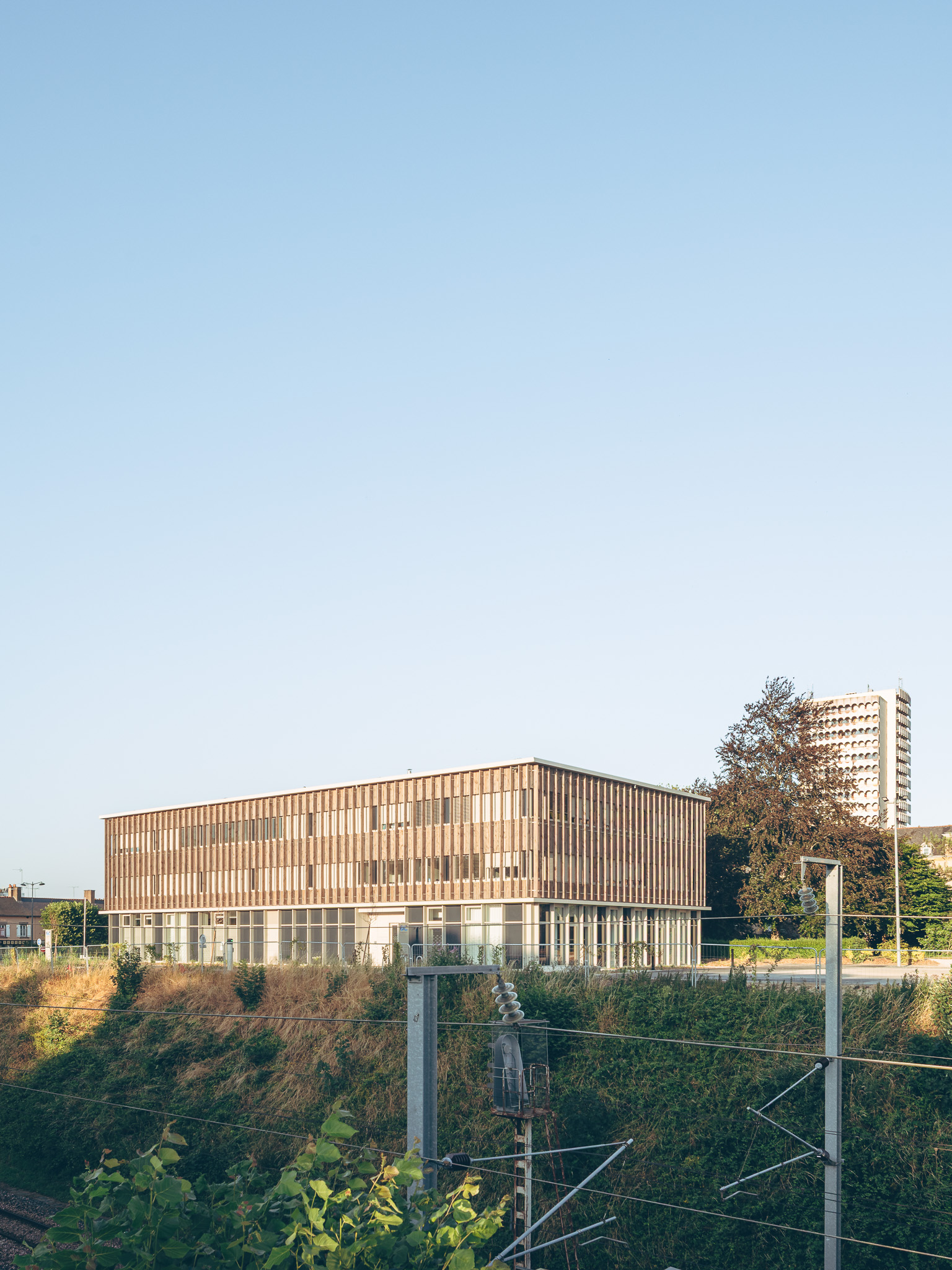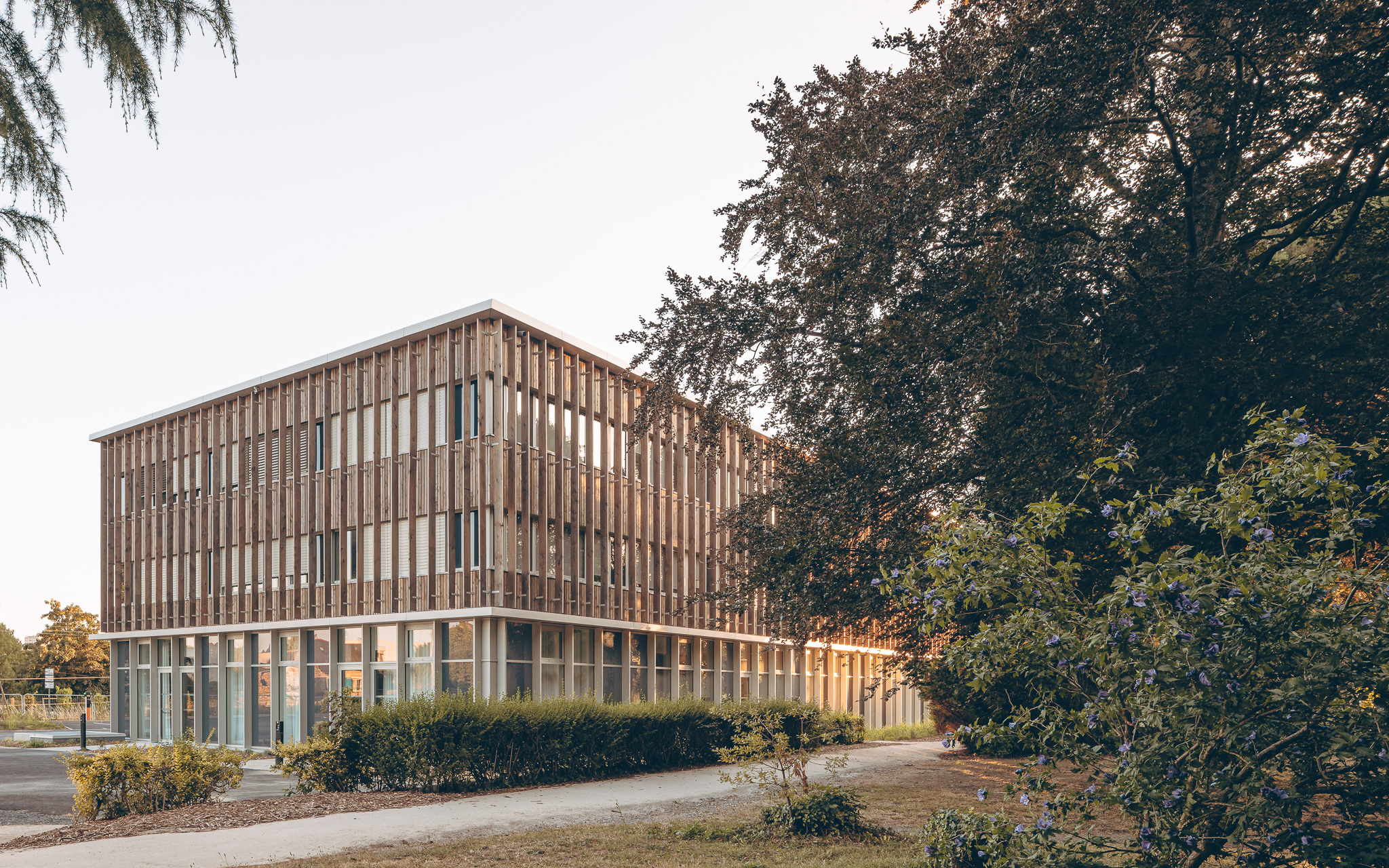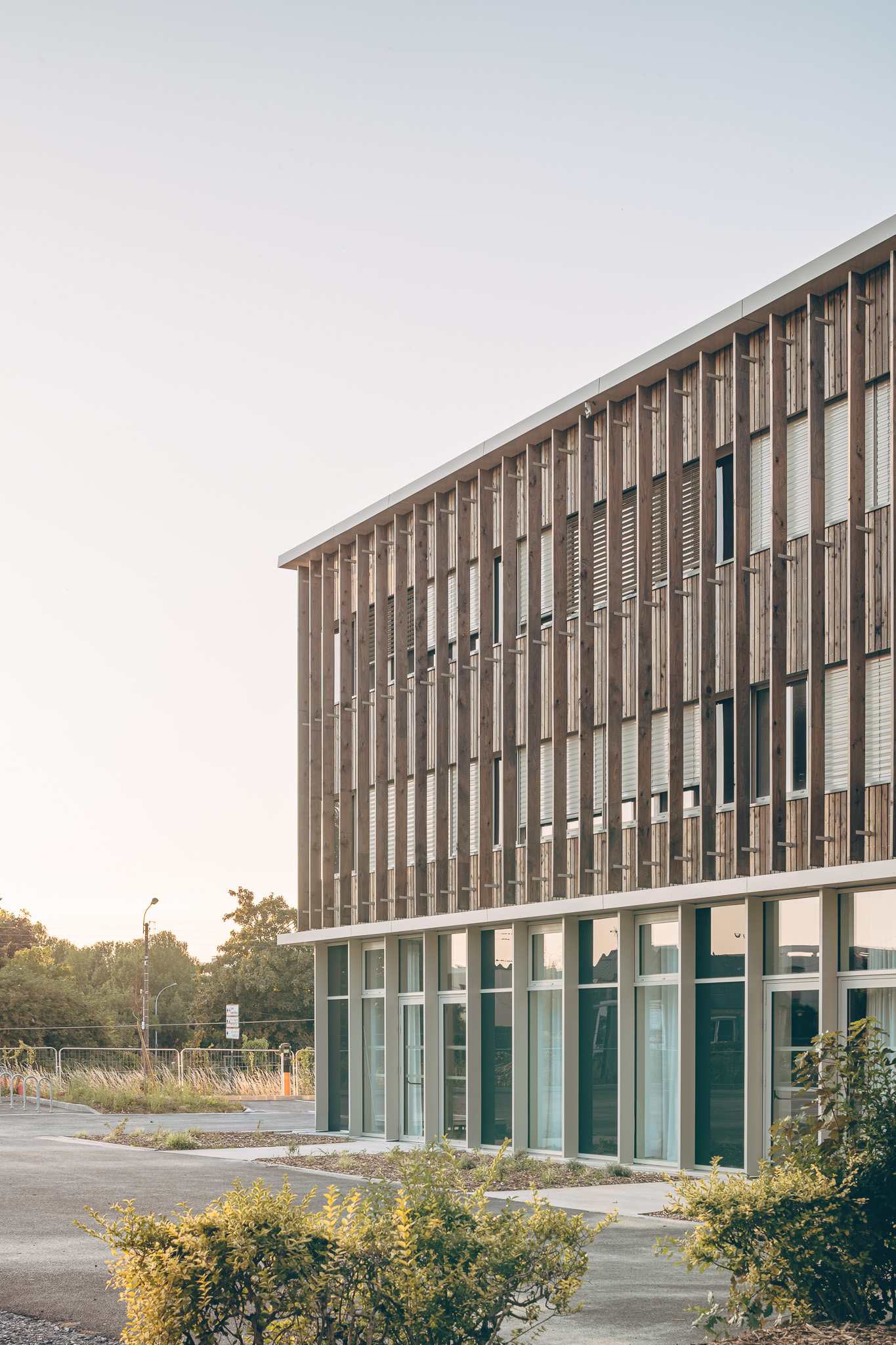 À noter : le bâtiment a été construit en bordure du parc (arbres classés) sans aucune perte de sol végétalisé. Il utilise l’emplacement de l’ancien parking, lui-même déplacé sur une ancienne station service rachetée par la DDEC au départ du projet.