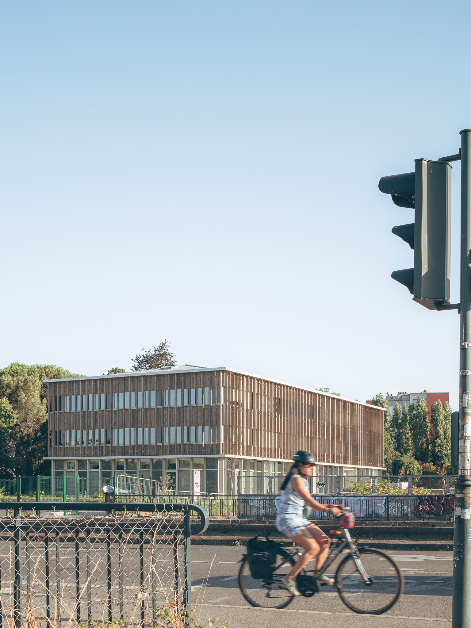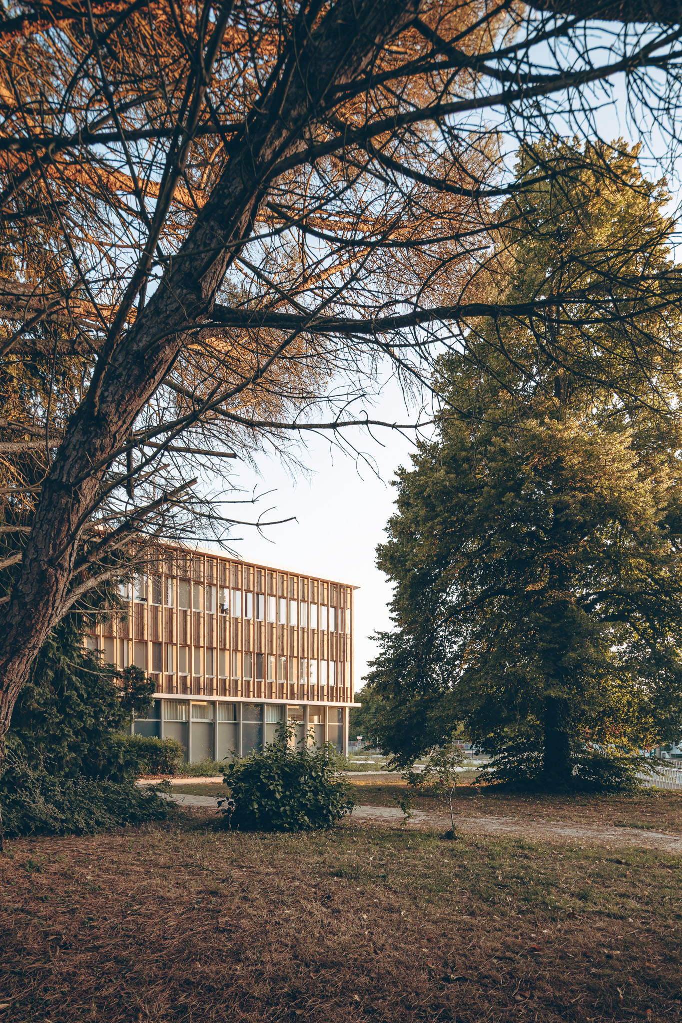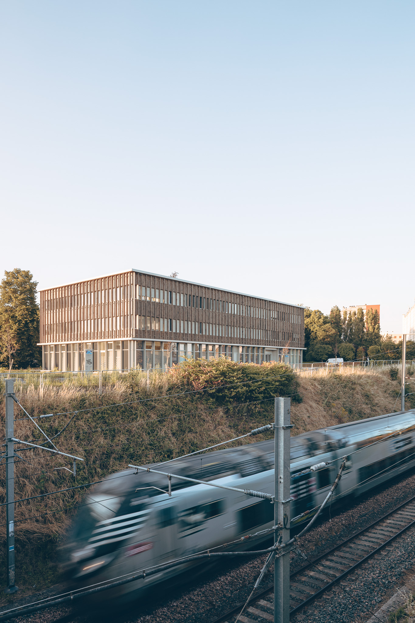 À noter : le bâtiment a été construit en bordure du parc (arbres classés) sans aucune perte de sol végétalisé. Il utilise l’emplacement de l’ancien parking, lui-même déplacé sur une ancienne station service rachetée par la DDEC au départ du projet.