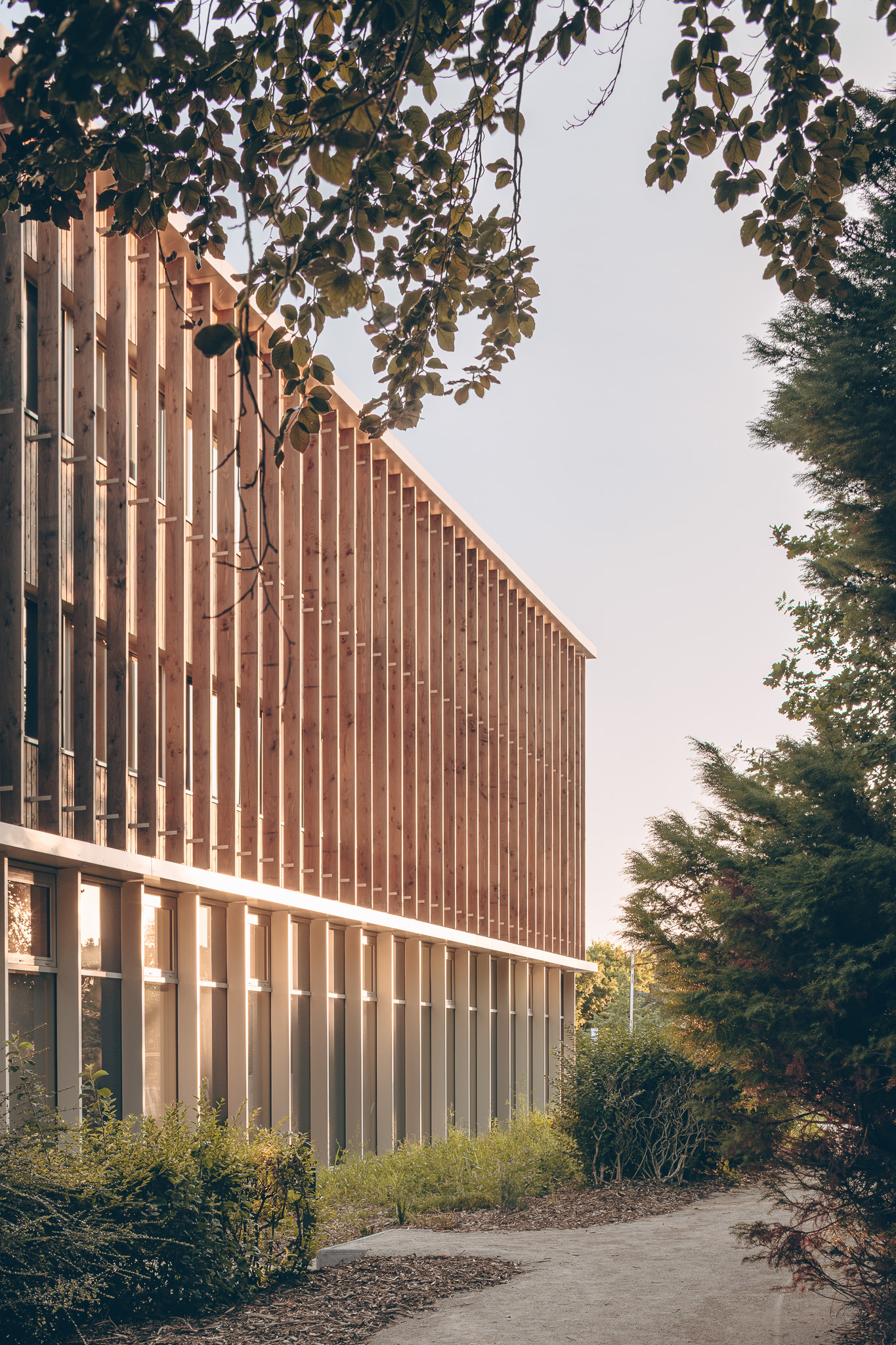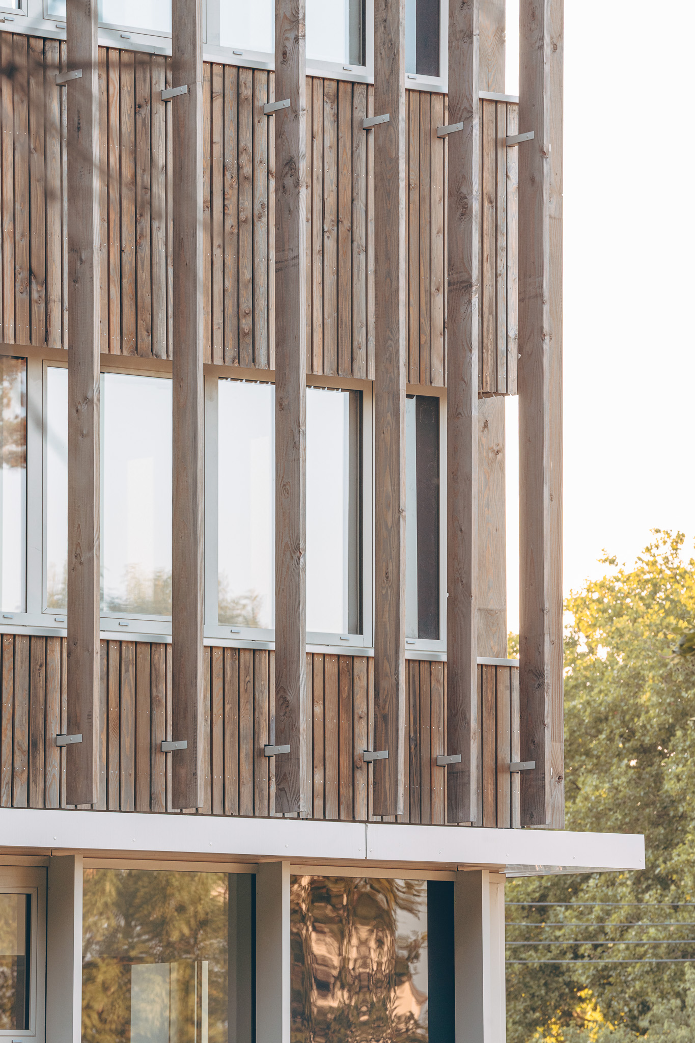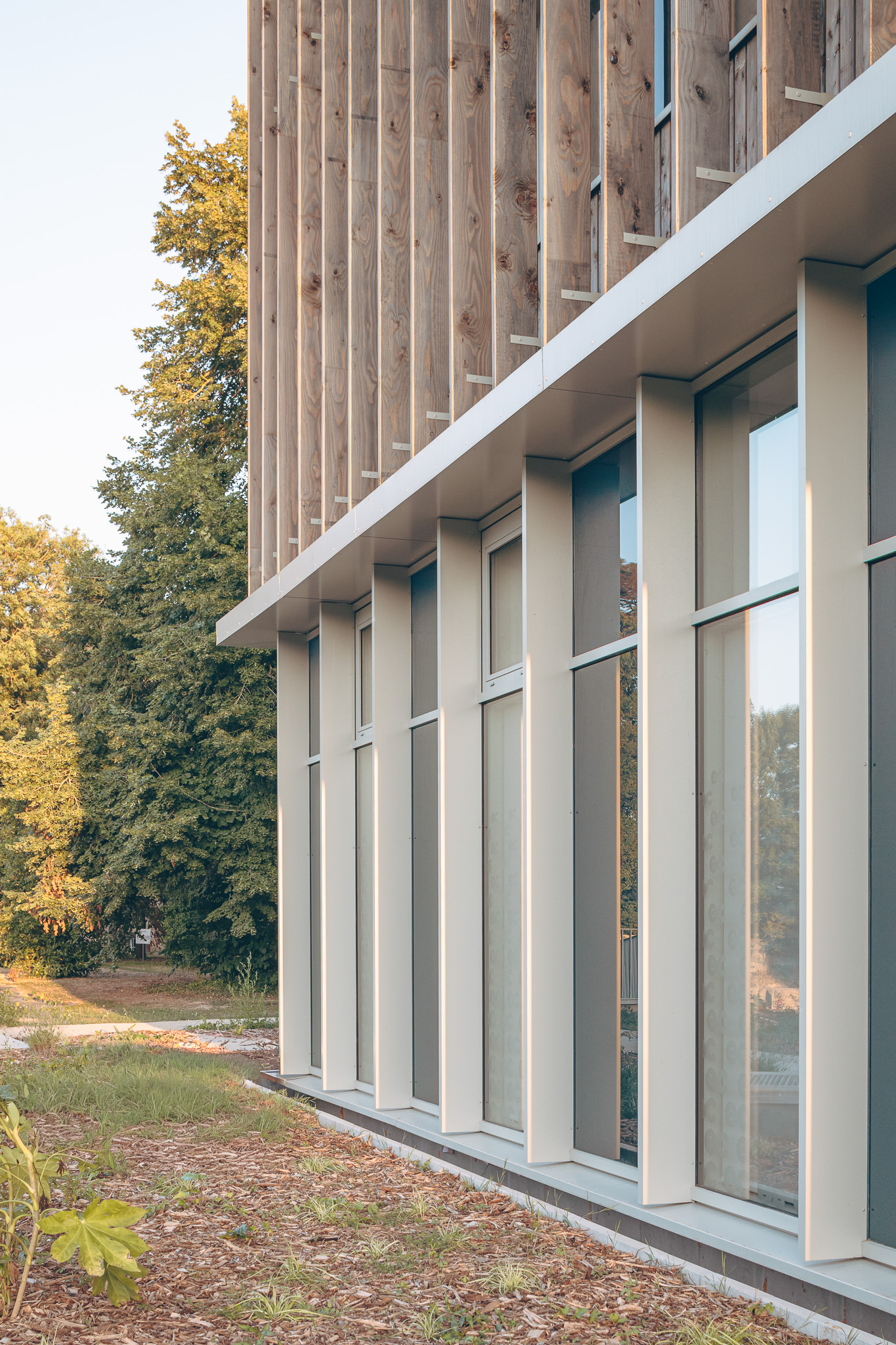 ▪️Des épines verticales en douglas, doublant le bardage bois, unifient les 2 niveaux suivants, conservant une lecture verticale malgré les menuiseries horizontales. Les modénatures présentes, bandeaux et corniches, complètent l’analogie.