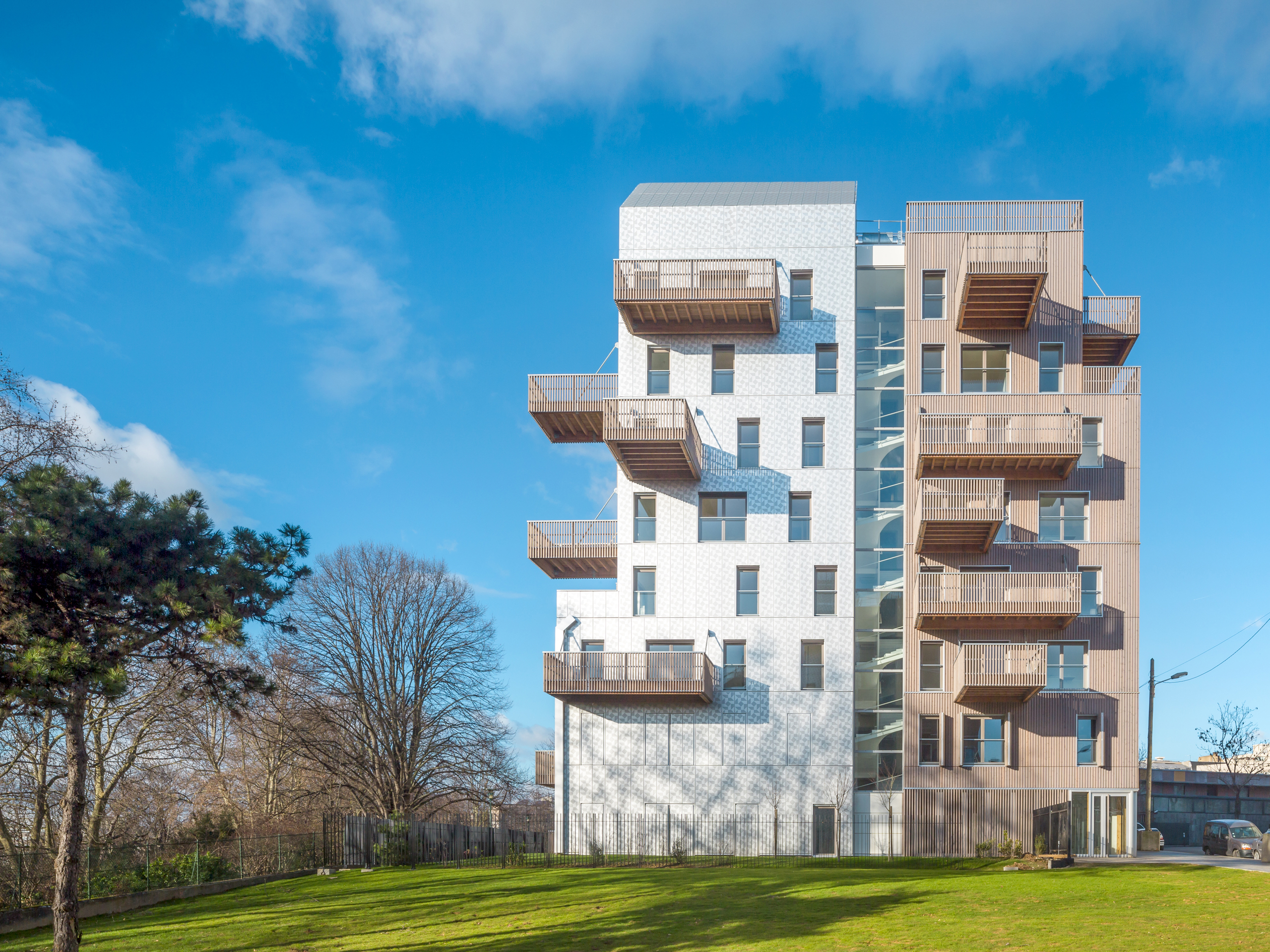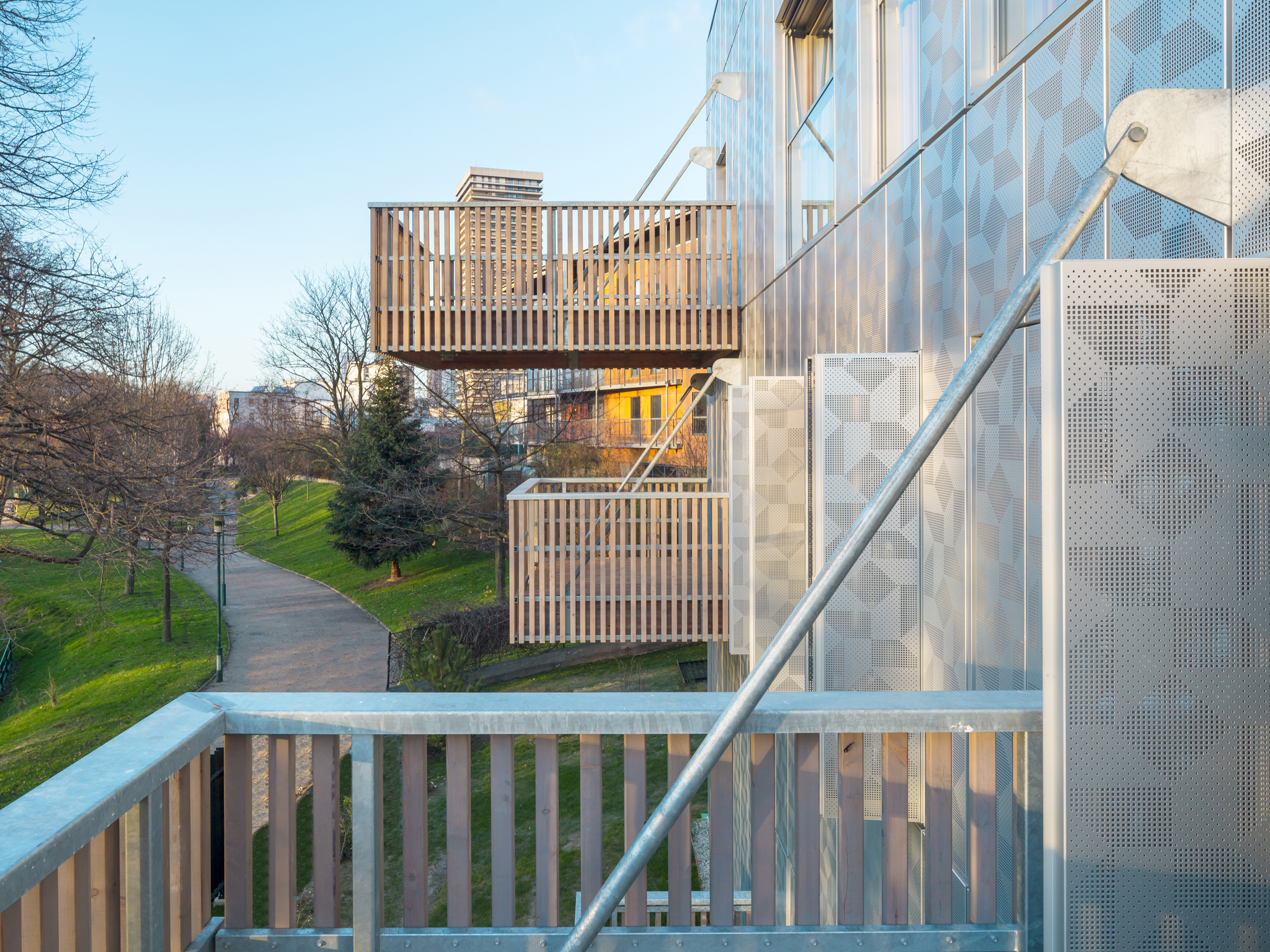 Les volumes Est et Ouest se différencient aussi par leurs hauteurs. Le volume Ouest sur le parc a été légèrement baissé pour réduire l’impact bâti sur l’espace vert et dissocier les deux volumes d’un même plot. Le traitement ajouré des gardes corps des toitures terrasses accentue encore plus cet effet.