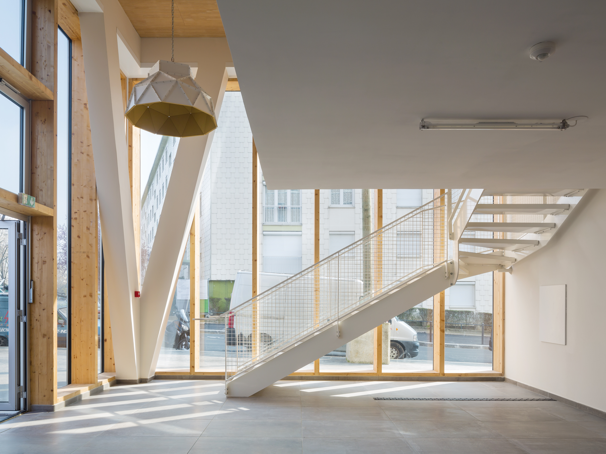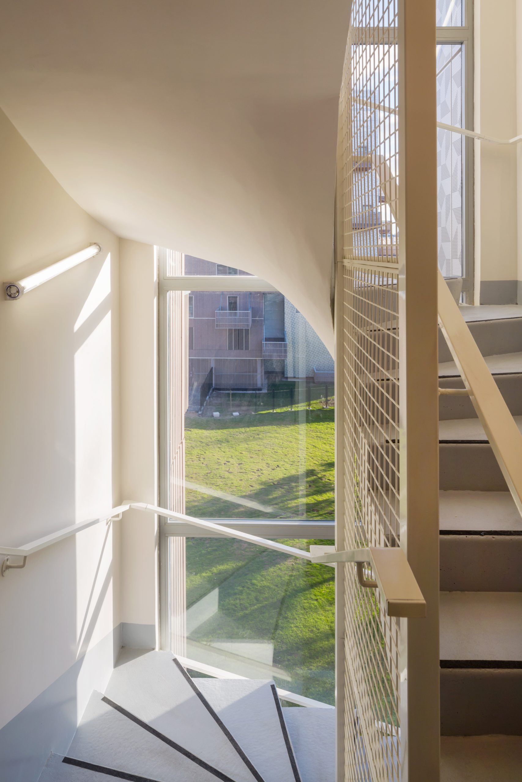 La faille, rupture entre les deux volumes, est entièrement vitrée côté Sud accueille les circulations verticales et les paliers à la forme rectangulaire rationnelle. Tous les paliers sont éclairés naturellement et permettent une vue lointaine à travers l’escalier vitré.