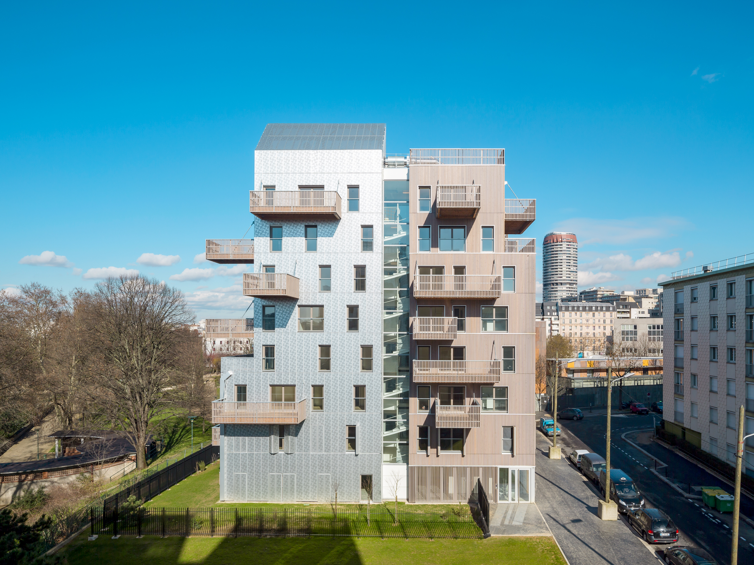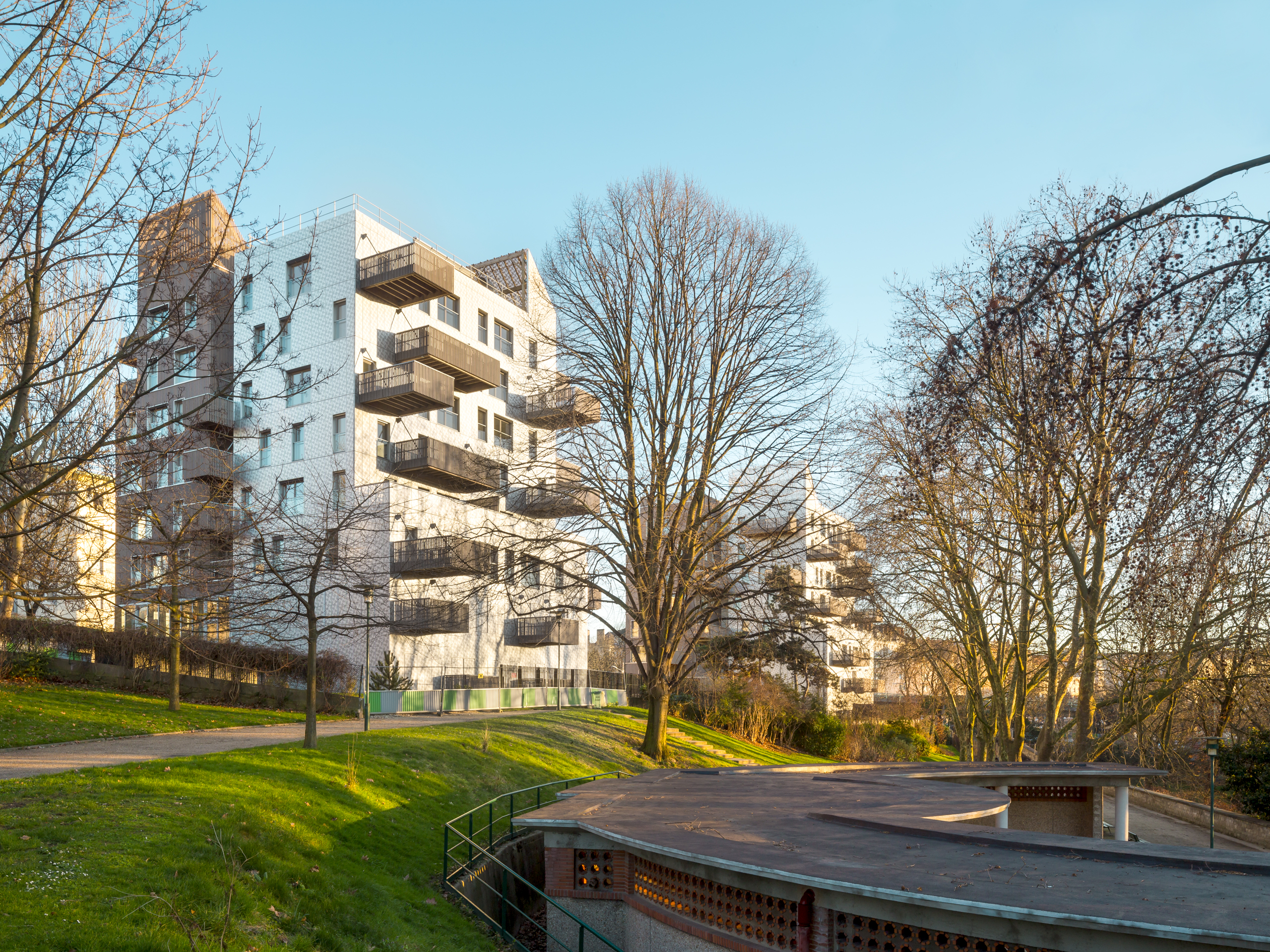62 logements en lisière du Parc Kellermann, répartis en deux plots autour d’un cœur paysager commun. La composition privilégie les vues, la lumière et la continuité avec le parc, jusque dans les espaces de circulation.